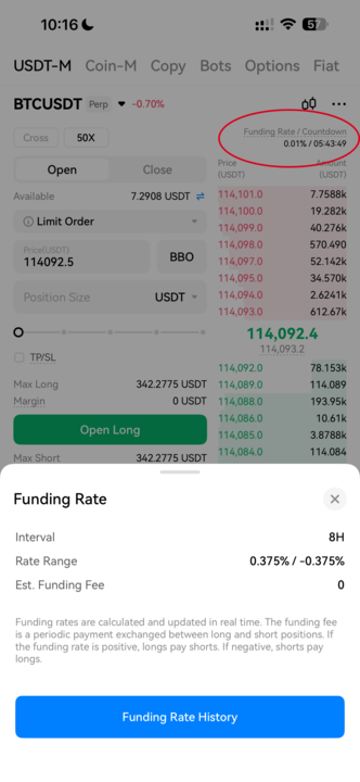 To view the latest funding intervals and previous funding rates, you can go to the Real-Time Funding Rate and Funding Rate History pages.