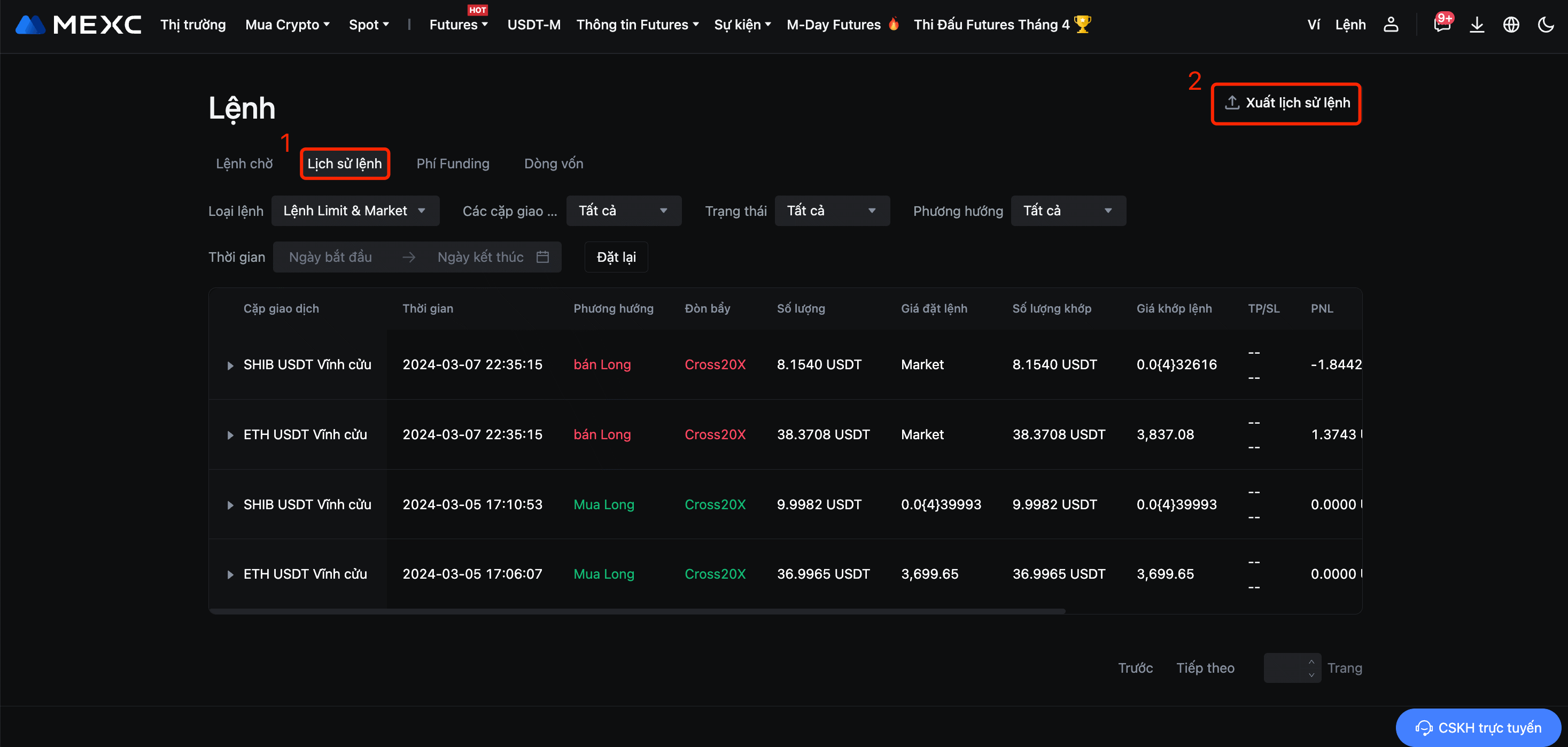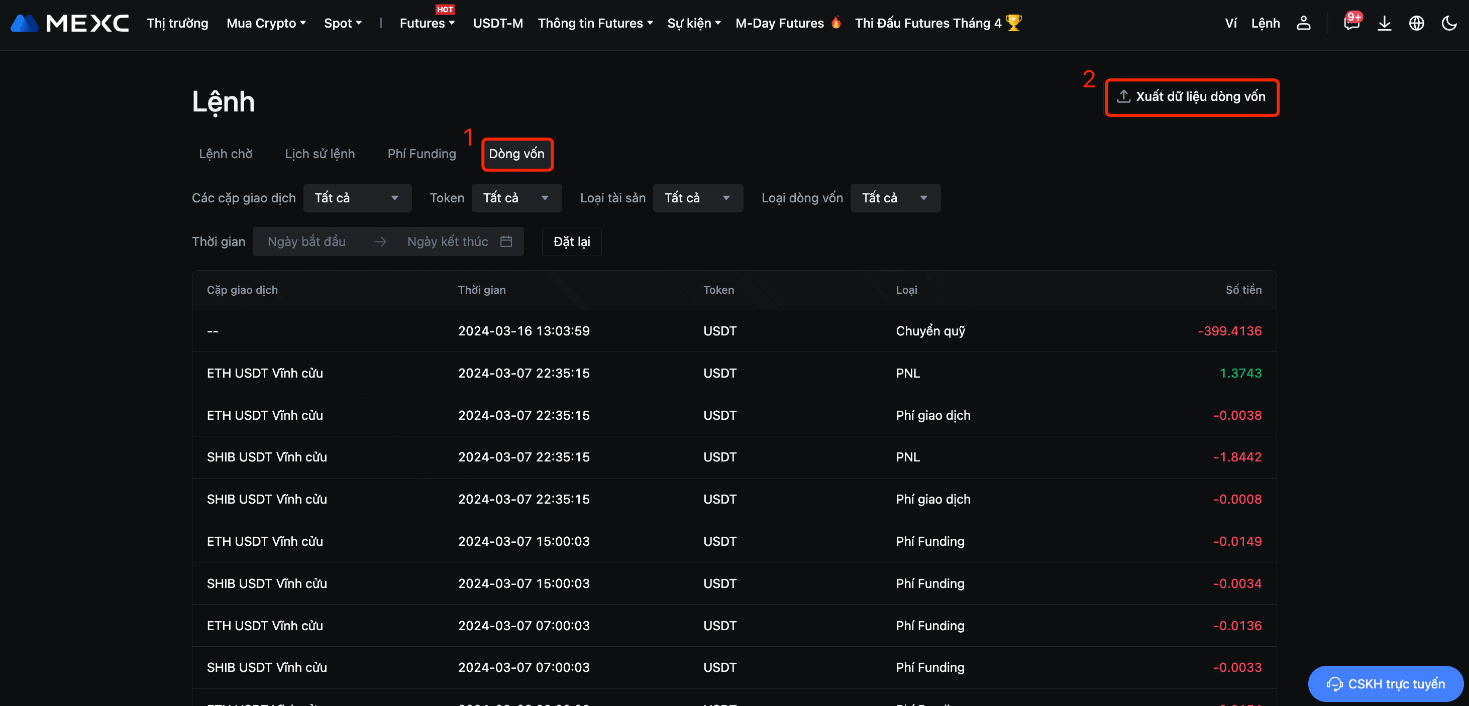 Đăng nhập MEXC, tại trang chủ, chọn [Lệnh] - [Lệnh Futures] để mở trang tương ứng, tại giao dịch Lệnh Futures, vui lòng chọn [Lịch sử lệnh] - [Xuất lịch sử lệnh] hoặc [Dòng vốn] - [Xuất dữ liệu dòng vốn], tại đây người dùng có thể chọn định dạng tệp PDF để xuất dữ liệu.