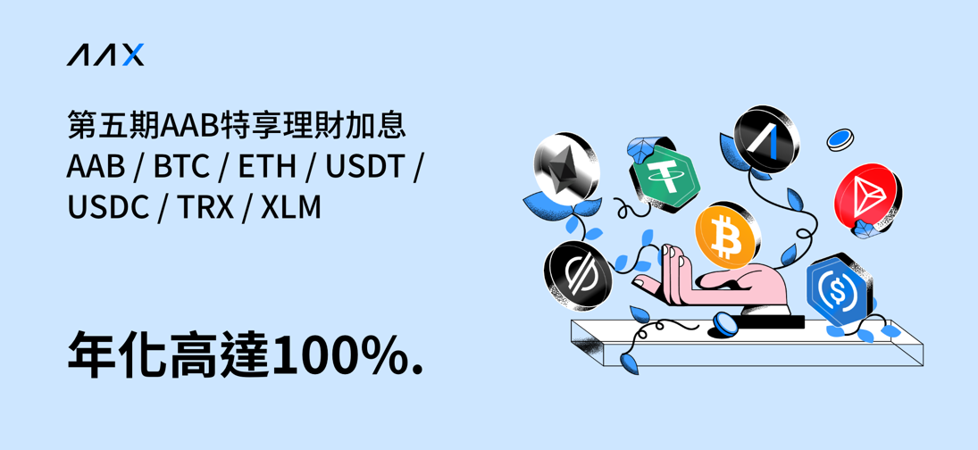 AAX將開啟第五期AAB特享理財加息活動,最高可享100%超高年化。本期活動幣種為AAB/BTC/ETH/USDT/USDC/TRX/XLM,詳情如下: