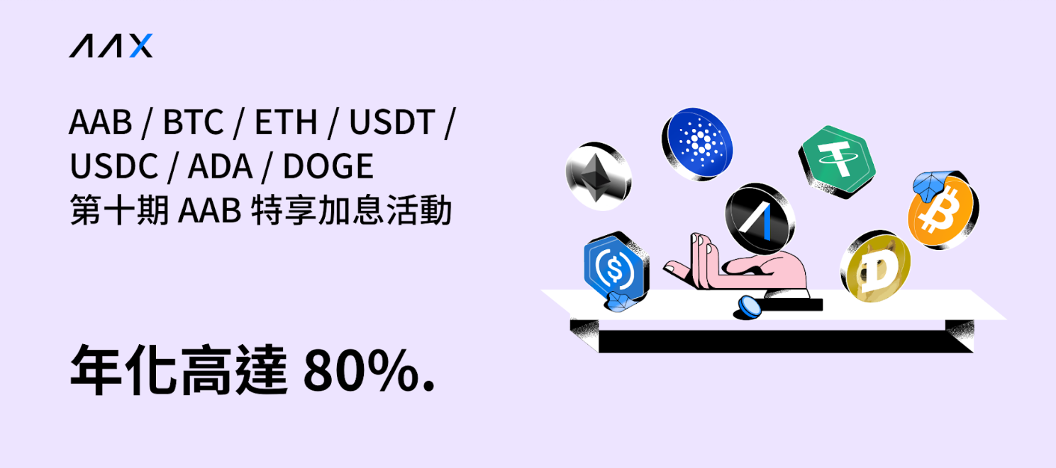 AAX將開啟第十期AAB特享理財加息活動,最高可享80%超高年化。本期活動幣種為AAB/BTC/ETH/USDT/USDC/ADA/DOGE,詳情如下: