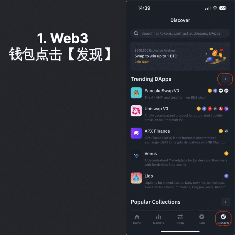 幣安Web3錢包已完成各類dApp集成。僅需簡單幾步,用戶即可通過幣安Web3錢包與集成的去中心化應用程序(dApp)進行交互。登陸幣安App,點擊【資金】 > 【Web3】 > 【發現】 > 【熱門DApps】即可體驗。