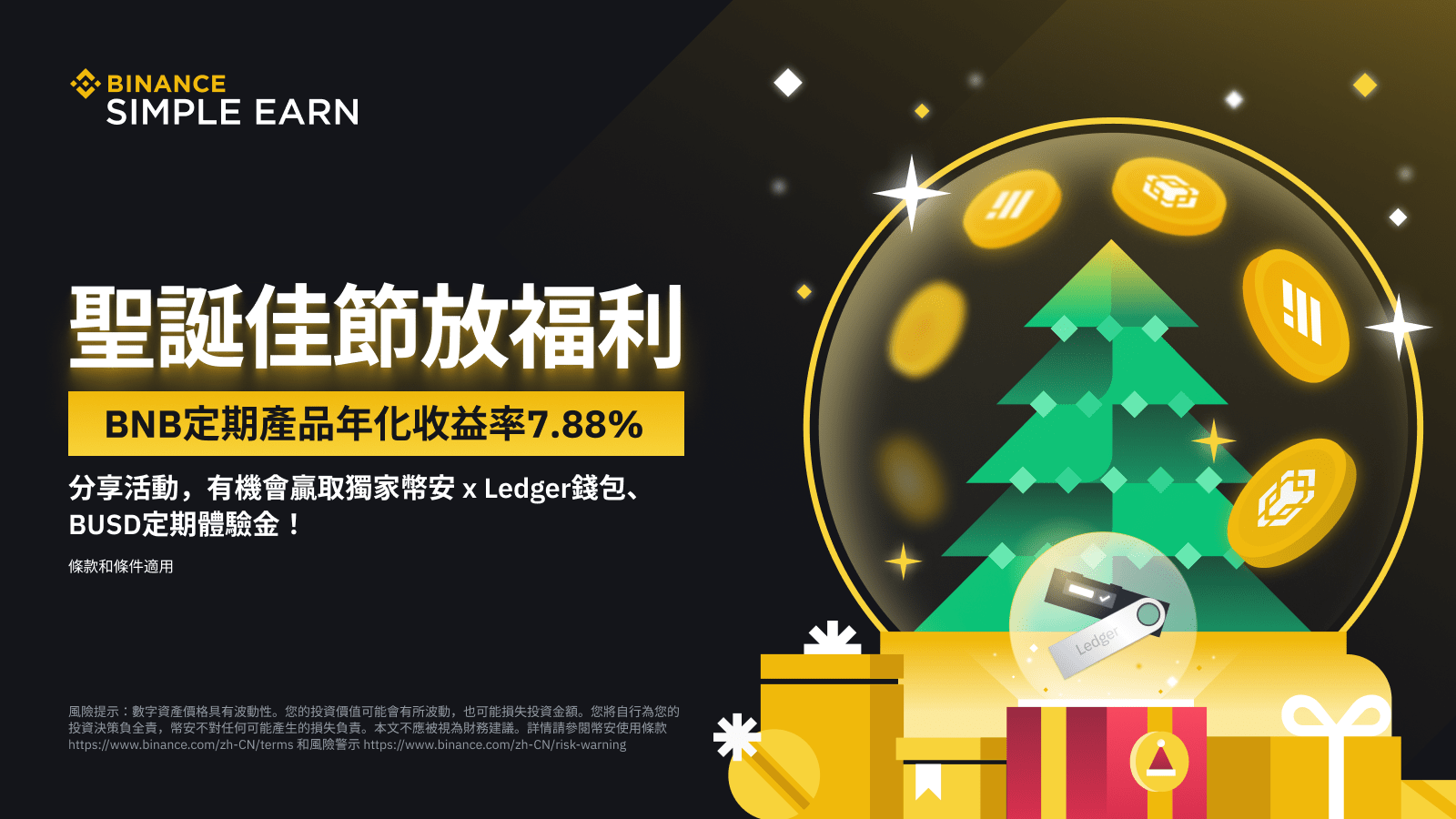 所有用戶在活動期間申購BNB定期產品,均可享受14天7.88%年化收益率。 此外,所有在其社交媒體上分享活動的用戶,都有機會獲得BUSD定期體驗金券或獨家幣安 x Ledger 硬件錢包!