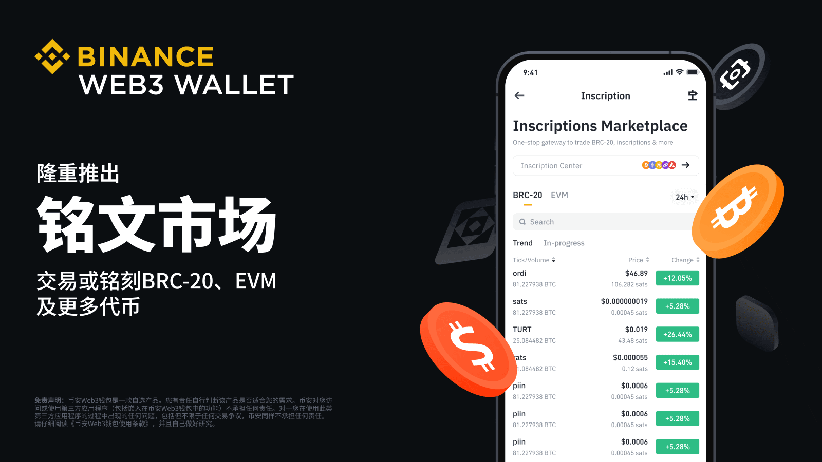 幣安已正式推出幣安銘文市場,為用戶銘刻、交易各種銘文代幣提供一站式解決方案,支持BRC-20、以太坊虛擬機(EVM)等多種銘文代幣。幣安銘文市場集成在幣安Web3錢包中,登陸幣安App即可輕松訪問。