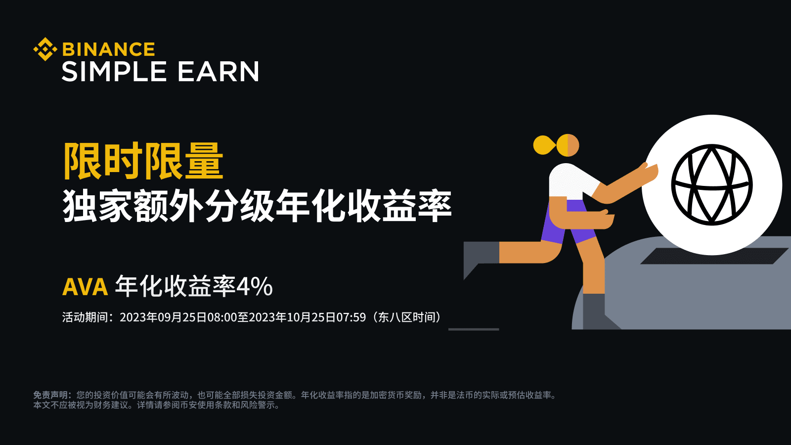 幣安賺幣平臺將推出AVA活期產品活動!在活動期間申購AVA賺幣活期產品,除了可獲得實時年化收益之外,還可享受4%獨家額外分級年化收益。