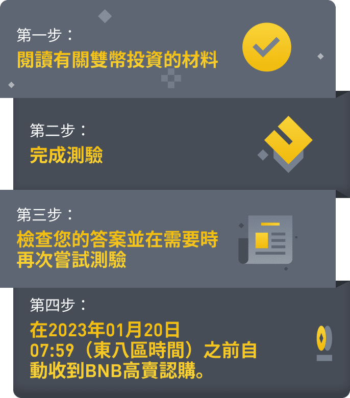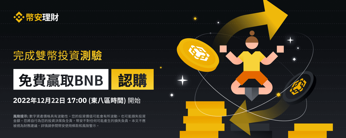 了解雙幣投資並完成測驗,以獲得雙幣投資BNB認購!