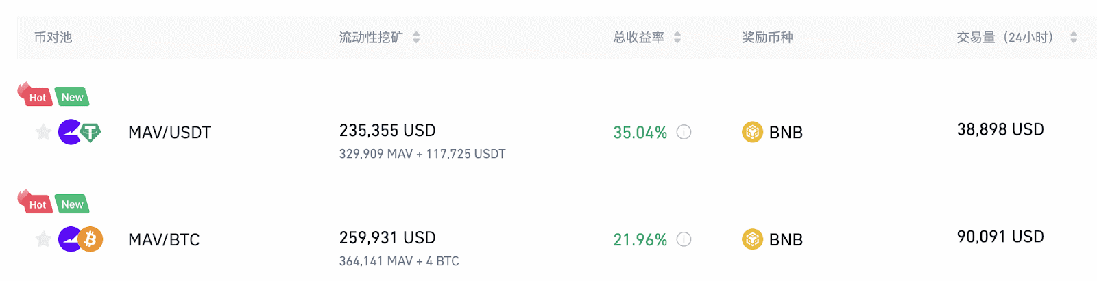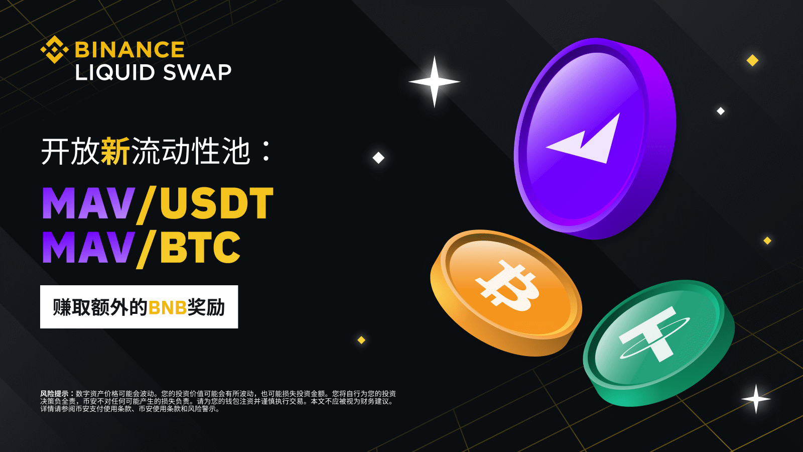 幣安流動性挖礦支持MAV/USDT、MAV/BTC流動性池,并提供額外的BNB獎勵