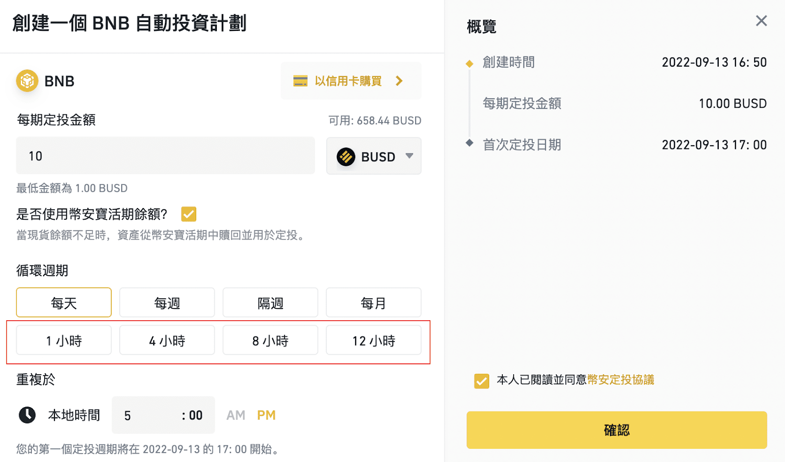 幣安定投已啟用小時計劃,用戶可以自動化他們的平均成本投資策略,以提供更多靈活性,。用戶現在可以使用定投上的任意可用小時計劃(即 1小時、4小時、8小時或12小時)完成加密貨幣購買。詳情如下圖所示。