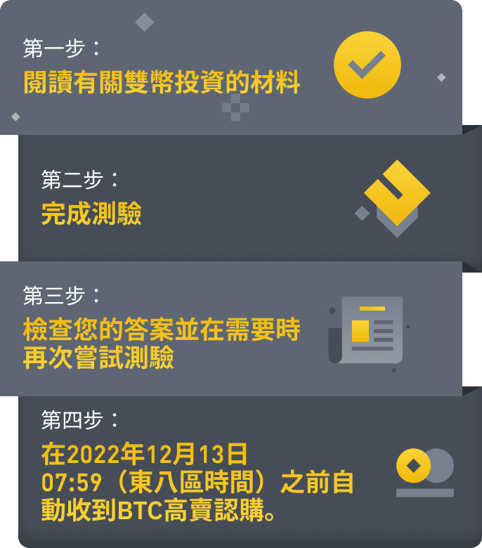 了解雙幣投資並完成測驗以獲得雙幣投資BTC認購!