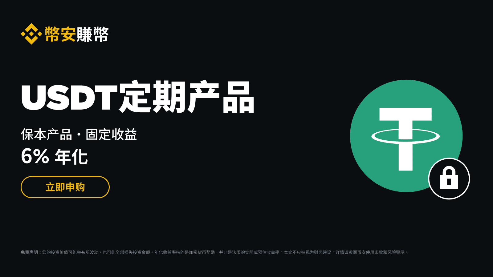 幣安賺幣平臺已上線USDT定期產品,采用固定利率!即日起完成申購USDT定期產品的用戶,享6%年化收益率。
