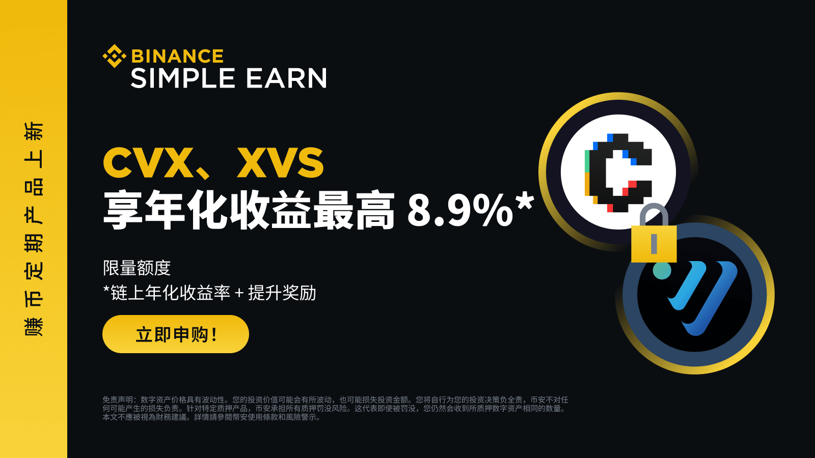 幣安賺幣平臺將于2024年01月12日20:00(東八區時間)上線Convex Finance(CVX)、Venus(XVS)定期產品,申購即可賺取最高8.9%年化收益,邀您體驗。