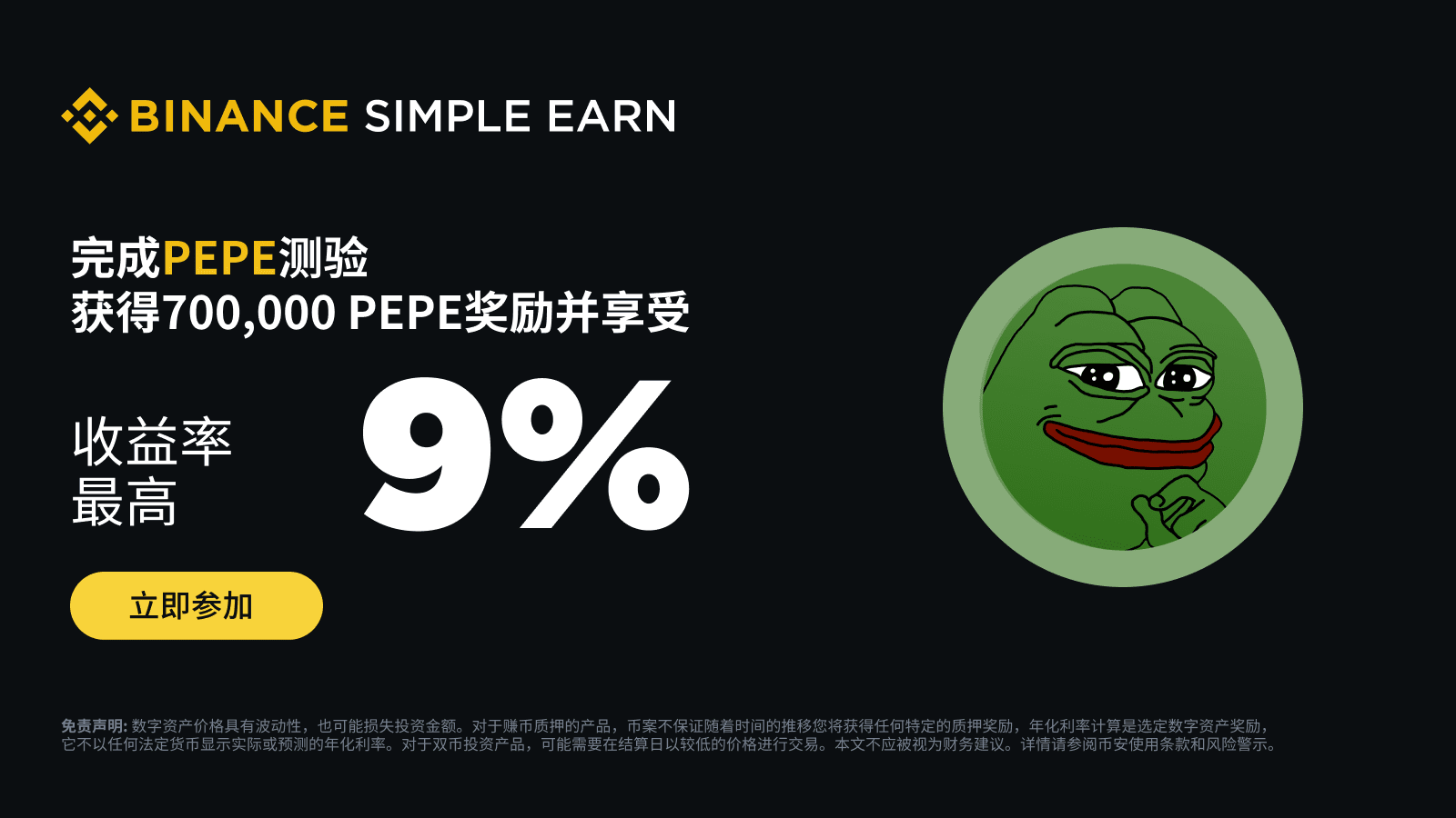 PEPE賺幣產品:完成測驗獲得700,000 PEPE獎勵,享最高9%額外分級年化收益!