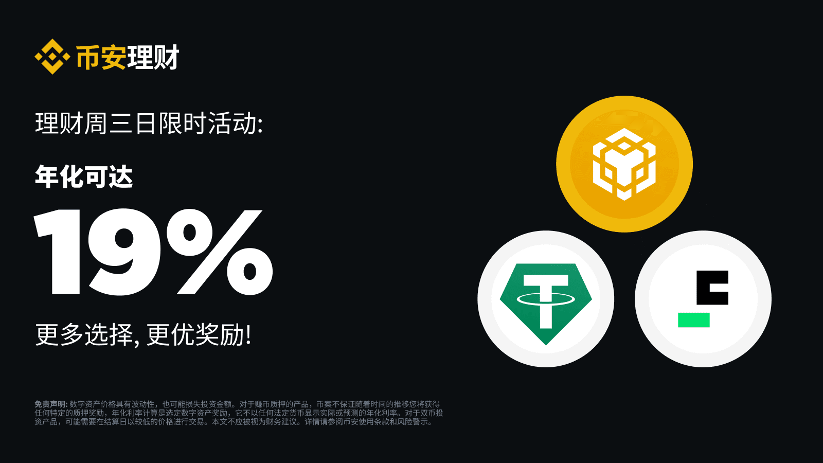 幣安理財每周三為您推出一系列新限時活動。請持續關注“幣安周三理財日”,通過幣安賺幣平臺、ETH質押、雙幣投資等獲得收益。