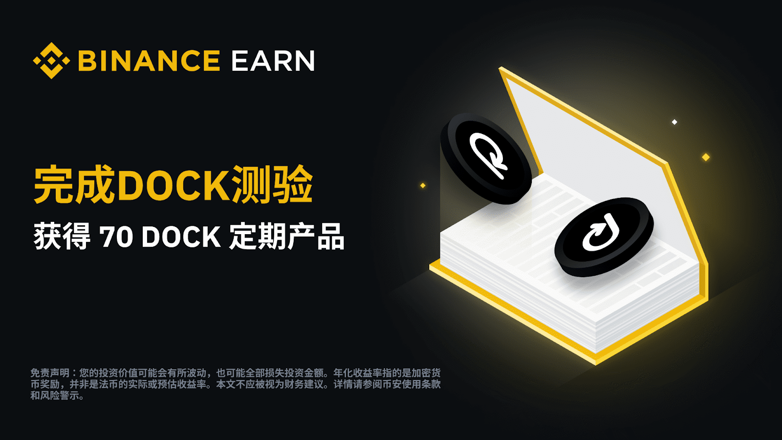 幣安賺幣平臺將推出賺幣DOCK測驗活動。活動期間,前48,000名通過DOCK官網學習相關知識并在測驗中正確回答所有問題的賺幣新用戶,每人將有資格獲得免費的70 DOCK定期產品。