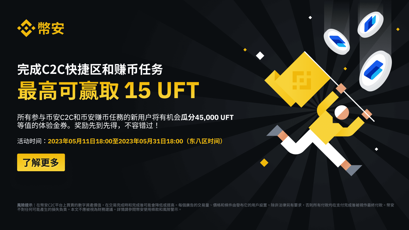 幣安C2C和幣安賺幣平臺很高興推出兩項活動,所有參與C2C快捷區和幣安賺幣的新用戶,都有資格參與并瓜分總額 45,000 UFT 的定期體驗金券。