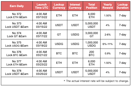 ://t.me/gateio_hodl_en我們將于2022 年 3 月 17 日凌晨 4:00(UTC 時間)準時啟動第 374 輪。我們計劃總共鎖定 3,000,000 GT,為期 7 天,預計年回報率為 2-6%