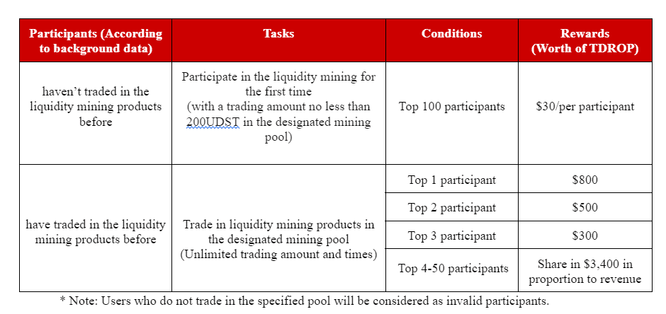 活動期間,官方將從所有參與本次Gleam任務的用戶中隨機抽取50名參與者,贈送$20 TDROP/每位參與者。