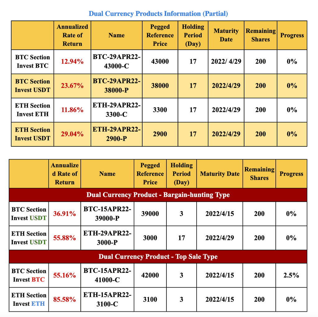 3、抄底:如果您使用USDT買入低價的雙幣產品,幫助您在獲得額外年化收益的同時自動以更合理的價格買入BTC/ETH,則您已成功抄底。