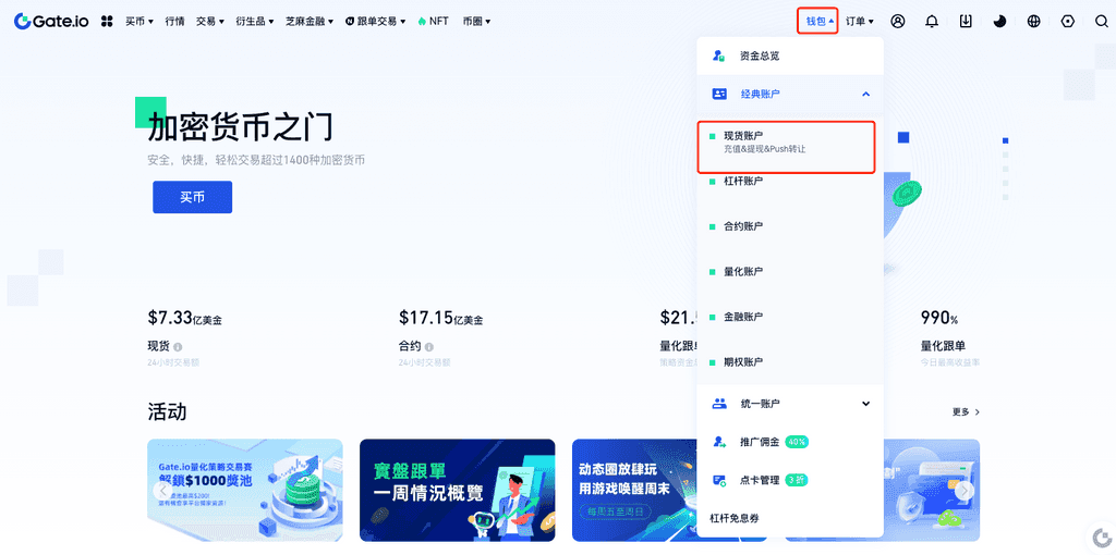 1.登錄Gate.io Web端口,點擊頁面右上角“錢包”——“經典賬戶”——“現貨賬戶”。