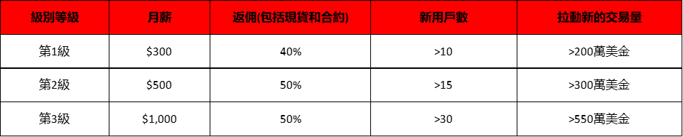 1. 第1級 - 1個月內邀請至少10個新交易用戶,1個月內所有被邀請用戶的累計交易額達到200萬美金,每月獎勵300美金。