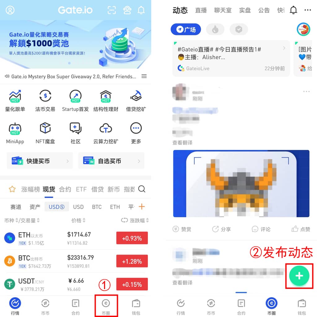 手機端APP:登錄最新版APP-選擇下方“幣圈”即可進入動態頁面