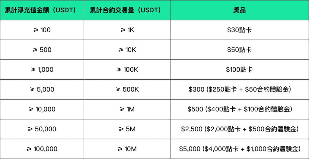 活動期間,新註冊用戶進行充值,並交易USDT本位永續合約,最高領$5,000福利禮包,限前5,000名用戶,先到先得!