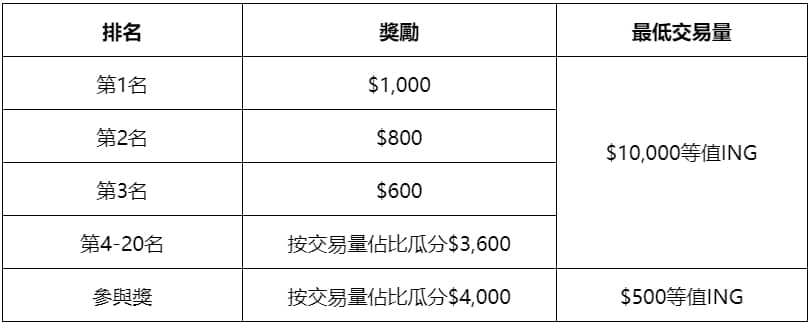 活動一:交易ING瓜分$10,000美金等值代幣大獎