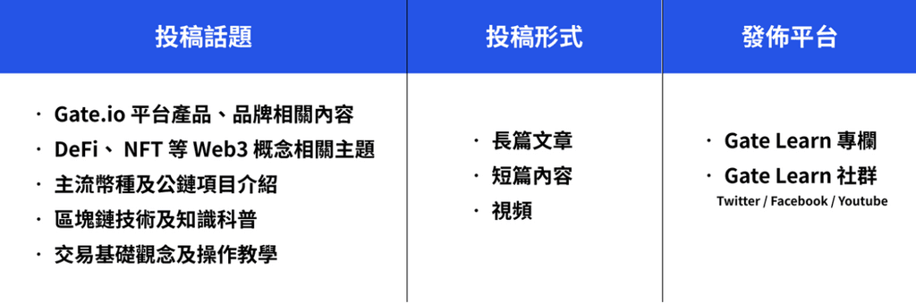 參與流程1.選擇創作方向,進行內容創作2.即日起至 2 月 28 日 (二) 23:59 , UTC 8 ,透過申請表,提交完成創作的作品3.經審核通過後發布於 Gate Learn 平臺👉🏻 點擊了解 Gate Learn 創作者專欄計劃