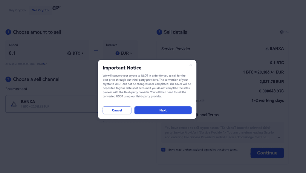 為了成功出售加密貨幣,您需要將您的加密貨幣轉換為 USDT。** 如果您在轉換 BTC 或其他非 USDT 加密貨幣后未完成此銷售,它將在您的 Gate.io 現貨錢包中顯示為 USDT。** 閱讀重要通知并單擊“下一步”將您的加密貨幣轉換為 USDT。如果您開始出售 USDT,則可以直接繼續,而無需執行此加密貨幣轉換步驟。
