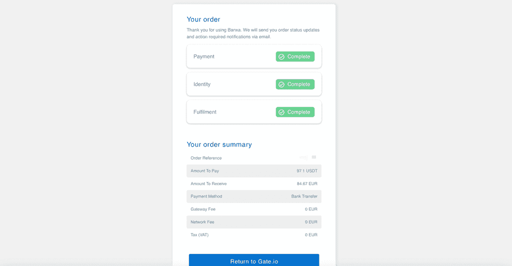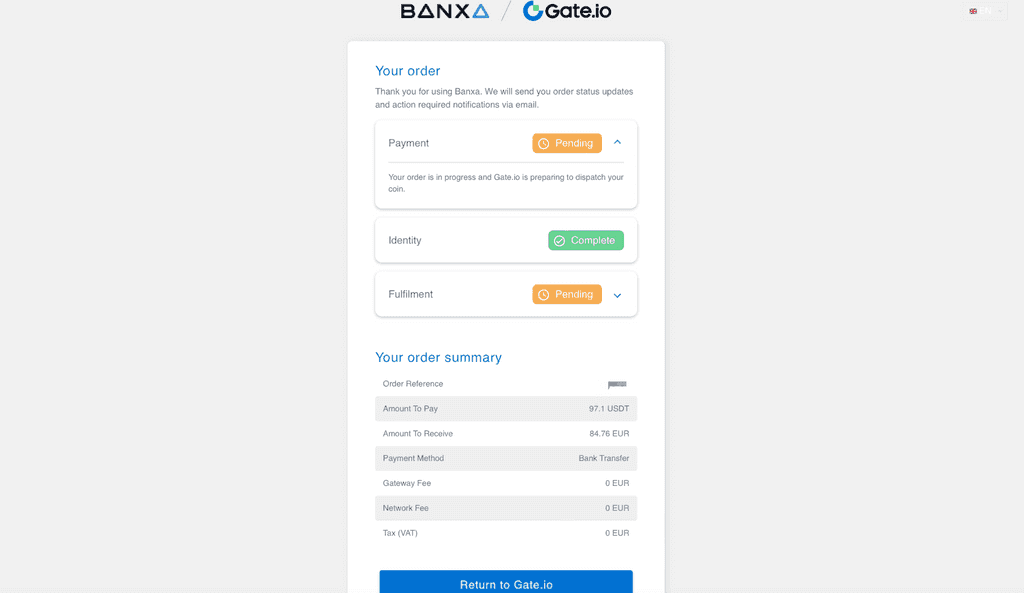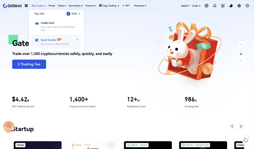 登錄您的 Gate.io 賬戶(已完成 KYC1),然后在主頁上單擊“購買加密貨幣 - 銀行轉賬”。