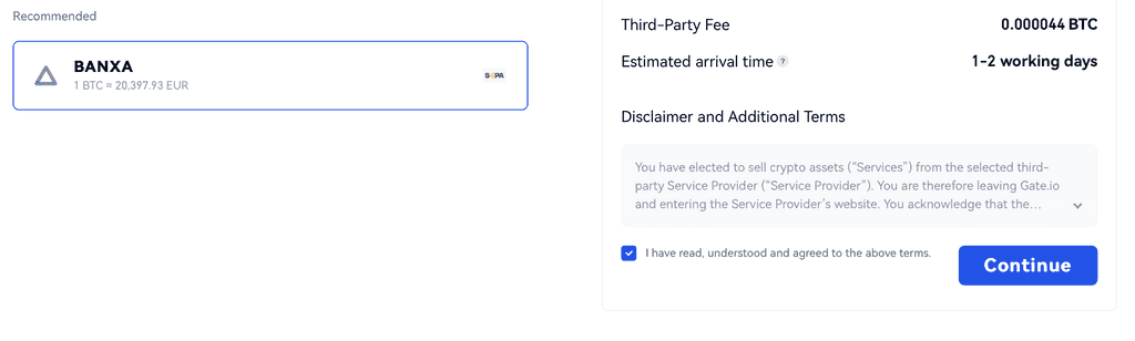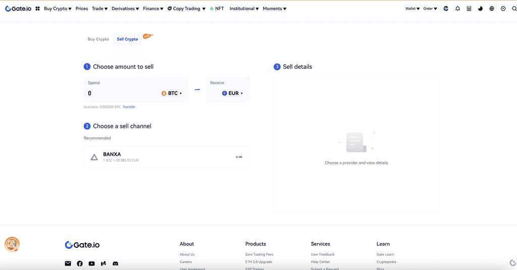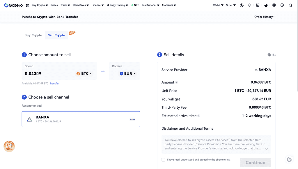 選擇您要出售的加密貨幣和數量,并選擇您要接收的法定貨幣。然后您可以根據估計的單價選擇付款渠道。例如,您想出售約0.04 BTC并通過Banxa接收歐元。