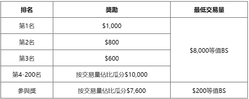 所有合格參與用戶均可根據交易量瓜分$20,000等值BS獎池。