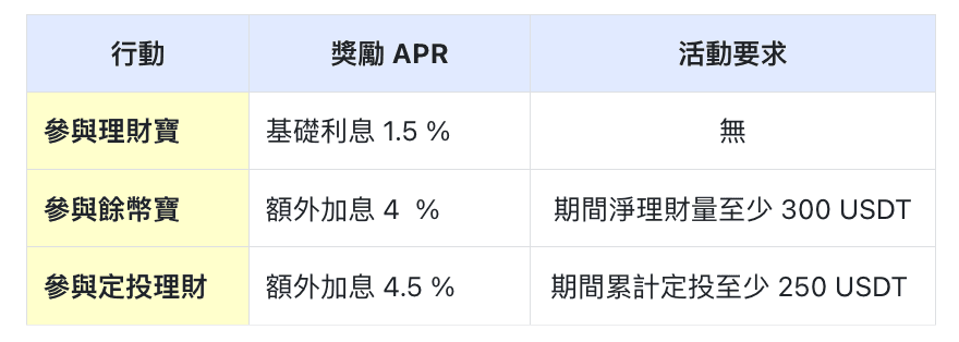 理財限時福利,完成指定任務, USDT 最高享 10 % APR !完成越多,賺的越多!