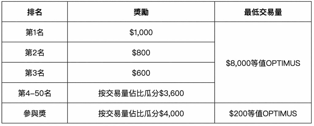 所有合格參與用戶均可根據交易量瓜分$10,000等值OPTIMUS獎池。