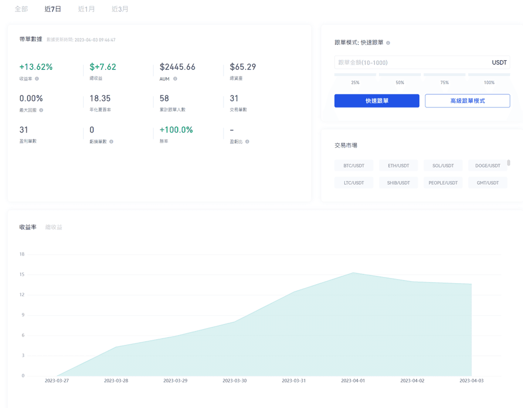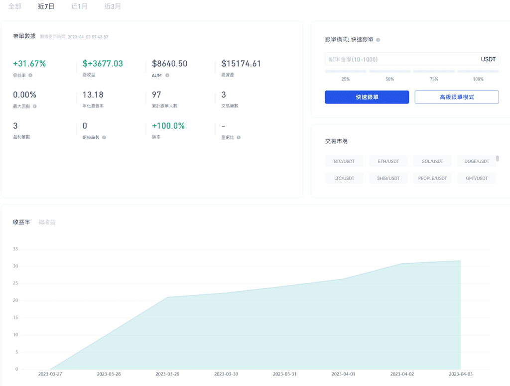 上期實盤跟單活動“Gate.io實盤跟單:新秀交易員曝光大作戰!”正在進行!我們已收到了很多優秀的交易員進行報名。我們進行了認真的篩選,特此公佈出2023-03-27~2023-04-03期間的新秀交易員:楓藍色、Lucy H.