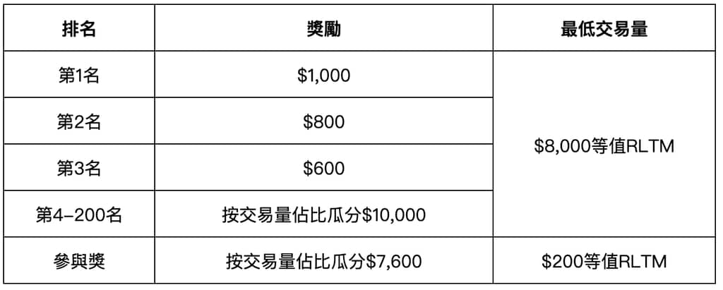 所有合格參與用戶均可根據交易量瓜分$20,000等值RLTM獎池。