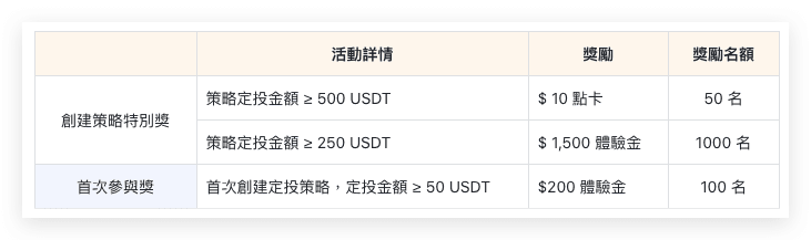 1.完成報名 - 報名連結2.建立策略 - 立即創建定投策略3.達成條件,輕鬆拿獎