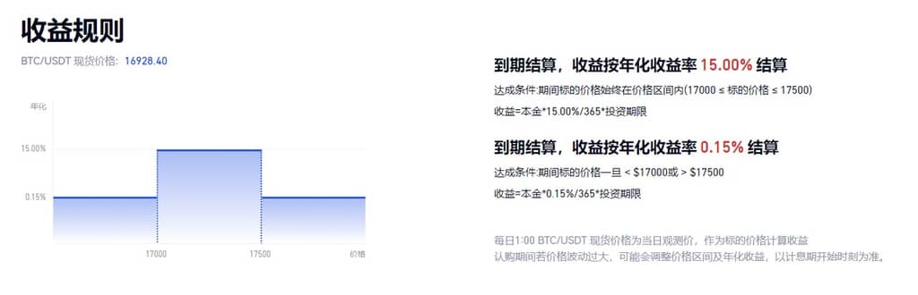 區間智贏每天都會面臨 2 種情況:**-第一種:**在觀察節點,目標資產價格未超出價格區間(即命中區間),用戶可以獲得高年化收益率(保本收益率<區間內收益率)。**-第二種:**在觀察節點,目標資產價格超出價格區間上限/下限(即向上/向下敲出區間),則用戶獲得保底收益。