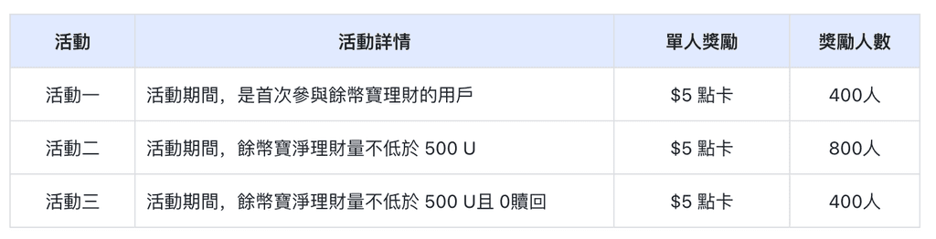 活動期間參與餘幣寶理財有機會瓜分$8,000點卡獎勵,多重獎勵可疊加領取,歡迎參與!