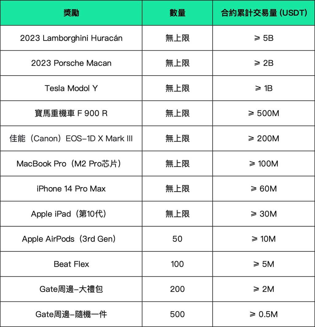 活動說明:1.合約交易量計算公式 = 活動期間開倉量 活動期間平倉量2.僅限Gate.io USDT本位永續合約的所有交易對 (BTC本位及交割合約等衍生品不參與)3.每個團隊參賽人數最高上限為5人;隊長創建團隊後,不能解散團隊。4.活動結束後將統計用戶(團隊)的合約累計交易量並發放對應的獎品,每位用戶(每個團隊)只能領取該活動獎勵1次。5.一個實名用戶只能使用一個帳號參加,子帳號不作為獨立帳號參與活動。除Web3用戶外,獲得比賽獎勵均需完成帳戶KYC。6.為維護比賽的公平性,本次活動僅限手動交易的用戶參與,API用戶和其他類型用戶不能參與。7.團隊可獲得的獎品僅限MacBook Pro及以上的獎品。活動期間,若團隊合約累計交易量<$100M,則該團隊將無法獲得任何獎品。8.活動期間,若隊長想刪除團隊成員,需聯繫官方Telegram: @Gateio_Affiliate進行審核,僅有當隊長和團隊成員均同意該訴求時,團隊成員才會被刪除。當團隊成員被刪除後,其產生的交易量也將從團隊總交易量中被刪除。9.當個人加入團隊時,將簽訂一份由隊長制定的活動獎勵瓜分協議,該協議在整個活動期間以及活動結束後的獎勵發放階段起契約約束作用。團隊所獲得的獎勵將在活動結束後發放給隊長,並由隊長按照約定的瓜分協議進行發放。10.本活動前三的實物獎勵涉及到車輛預訂、製造、運輸等流程,車輛最終交付至用戶的時間以車輛製造商實際交付時間為準。11.任何隊長提供的市場分析不代表 Gate.io意見,任何團隊成員遭受交易損失,Gate.io不承擔任何責任。12.風險提示:請用戶務必注意,虛擬幣交易受市場、政策等多方面因素影響,市場波動很大,漲跌難以預測,請務必注意市場風險,謹慎交易。13.如有作弊、刷量、對敲、自成交、操縱市場或其他違規作弊行為,取消用戶的參與資格及獎勵。14.Gate.io對本次活動有最終解釋權。