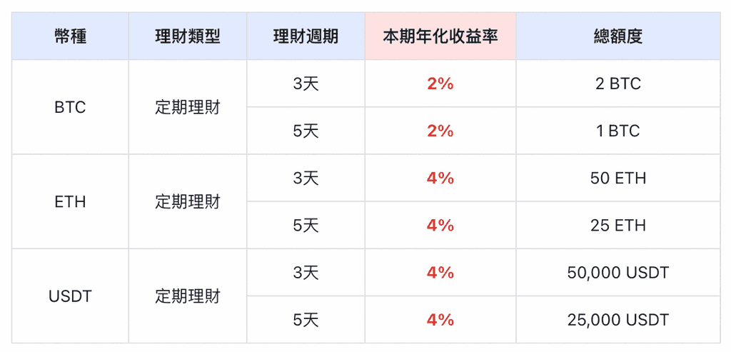 Gate.io理財寶每週五上線“主流幣瘋狂星期五”活動,新老用戶一鍵參與即可享受主流幣定期理財翻倍利率福利。本期活動幣種有BTC/ETH/USDT,理財週期短至3天收益率高達4% !認購額度有限,先到先得!