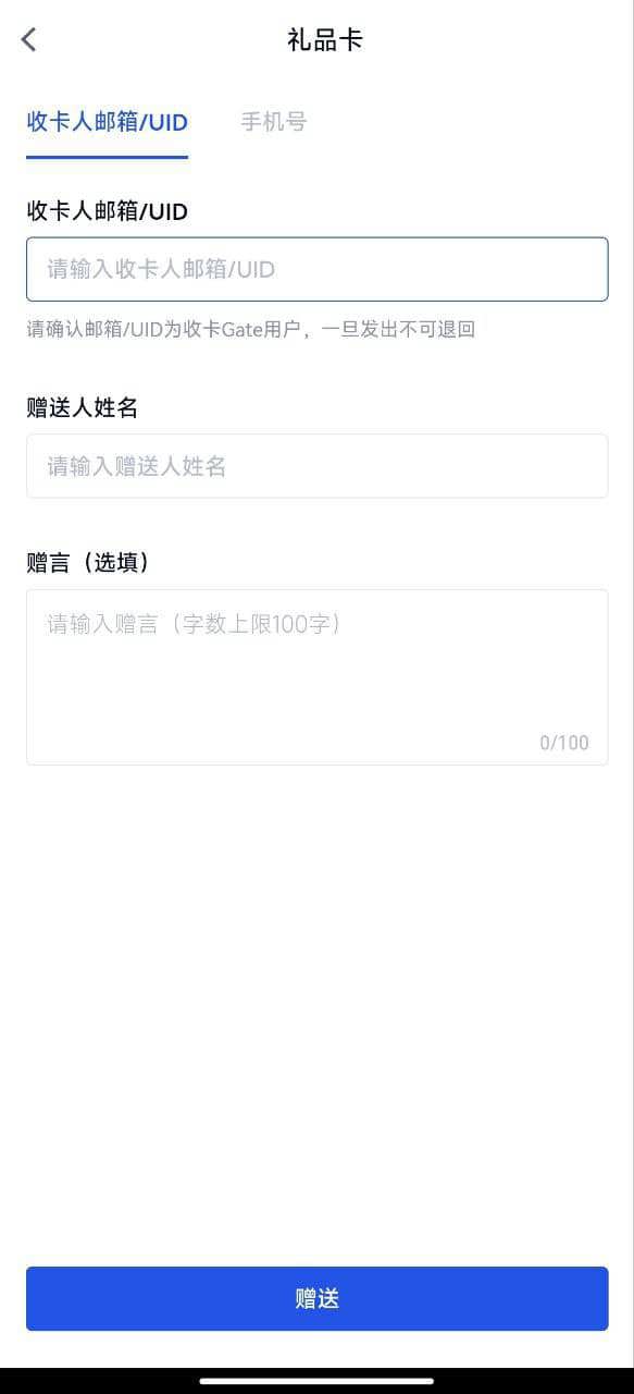 2.3 選擇【Gate用戶贈送】,輸入接收方Gate賬戶的電子郵箱,電話號碼或UID,以及贈送人姓名(需確保接收方是Gate用戶)。在該步驟可附上給接收方的消息。確認后即可點擊【贈送】