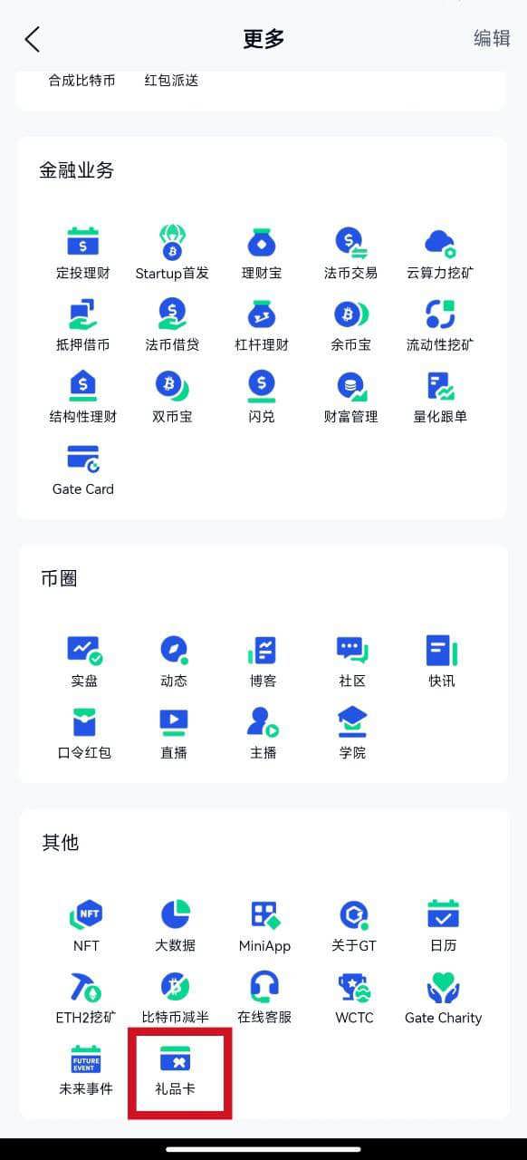 1.登錄Gate app,點擊主頁【更多】,再下滑至底部,點擊【禮品卡】