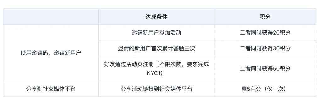 a.報名活動 👉 活動頁鏈接b. 閱讀相關文章,牢記知識點c. 每日可參與答題或邀請新用戶任務獲取積分d. 邀請好友共同參加,完成分享任務&好友為新用戶,都會獲得更高獎勵;e. 活動結束后,獎勵將根據你的累積積分發放至錢包賬戶;