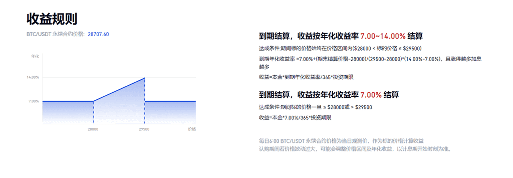 鯊魚鰭 是一種具有兩種盈利模式的產品。在觀察期間,如果目標資產價格始終未超出價格區間(即命中區間),用戶將獲得高年化收益率。此外,在結算時,目標資產價格越接近價格區間上限,年收益率也越高。如果目標資產價格曾經超出價格區間(即敲出區間),用戶將獲得保本收益率。