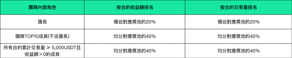 五、賽事規則大賽期間,各賽區內的合約團隊賽、合約個人賽、現貨個人賽均遵循以下規則:➣ 賽事一:合約團隊賽,占單個賽區獎池的70%,所有賽區總計瓜分最高$3,500,000(一)大賽期間,單個賽區內根據參賽團隊的【合約收益額】和【合約交易量】分別進行排名,其中按合約收益額排名的占合約團隊賽獎池的60%,按合約交易量排名的占合約團隊賽獎池的40%,具體規則如下: