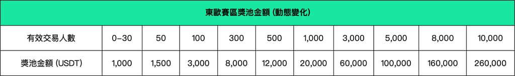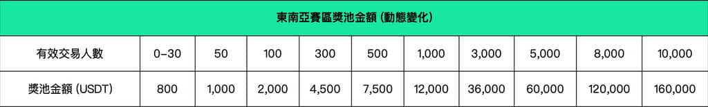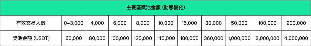四、賽區分配及獎池本次大賽共分為6個賽區:主賽區、東亞賽區、東南亞賽區、東歐賽區、東南歐賽區、拉美賽區。主賽區按活動參與人數動態分配獎池金額,最高$4,000,000;除主賽區外的其餘5個賽區,也分別按各自賽區的活動參與人數動態分配獎池金額,5個賽區獎池金額合計最高$1,000,000。活動期間,各賽區參與用戶越多,獎池金額越高,最終發獎的獎池金額由有效交易人數確定。在單個賽區內,合約團隊賽占該賽區獎池的70%,合約個人賽占該賽區獎池的20%,現貨個人賽占該賽區獎池的10%。各賽區獎池詳情如下: