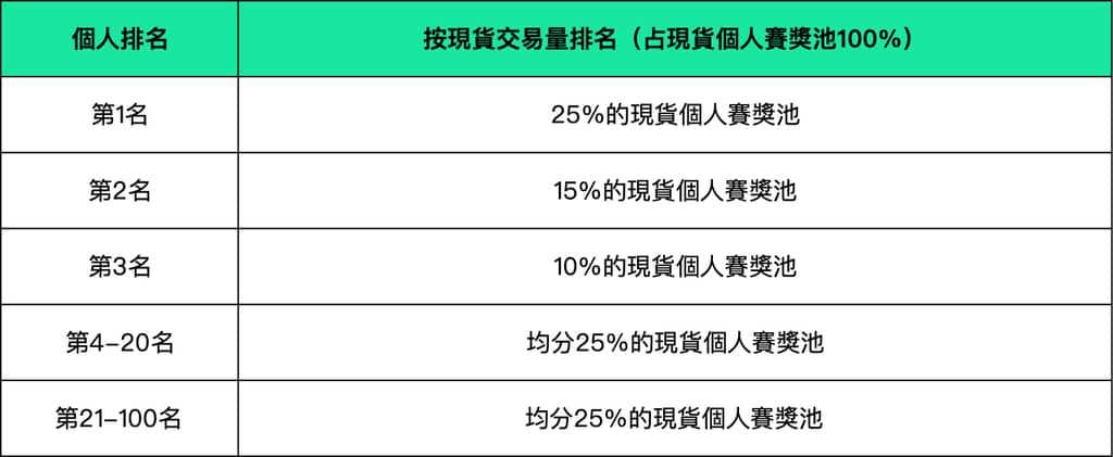 註:1.參與現貨個人賽排名,需滿足比賽期間個人現貨累計交易量 ≥ 10,000USDT;2.單個賽區內,參與現貨個人賽的用戶仍可選擇參與合約團隊賽,合約交易與現貨交易所得獎勵可同時兼得。