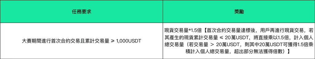 (二)大賽期間,單個賽區內參與現貨個人賽的用戶,完成以下任務,其現貨交易量將按一定倍數計入比賽,具體規則如下: