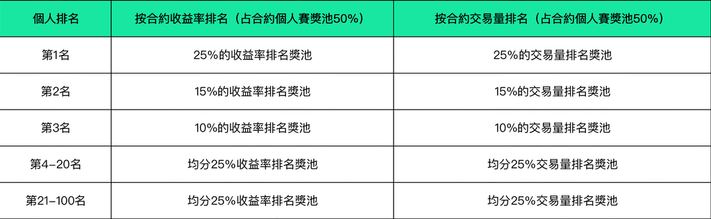 ➣ 賽事二:合約個人賽,占單個賽區獎池的20%,所有賽區總計瓜分最高$1,000,000大賽期間,單個賽區內參與合約個人賽的用戶根據【合約收益率】和【合約交易量】分別進行排名,其中按合約收益率排名的佔個人賽獎池的50%,按合約交易量排名的佔個人賽獎池的50%,具體規則如下: