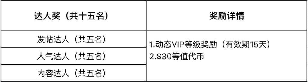 **一、新用戶獎:**活動周期結束后將選取10名分享優質內容的新用戶,每人$10等值代幣獎勵*新用戶定義:從未發布過任何動態內容